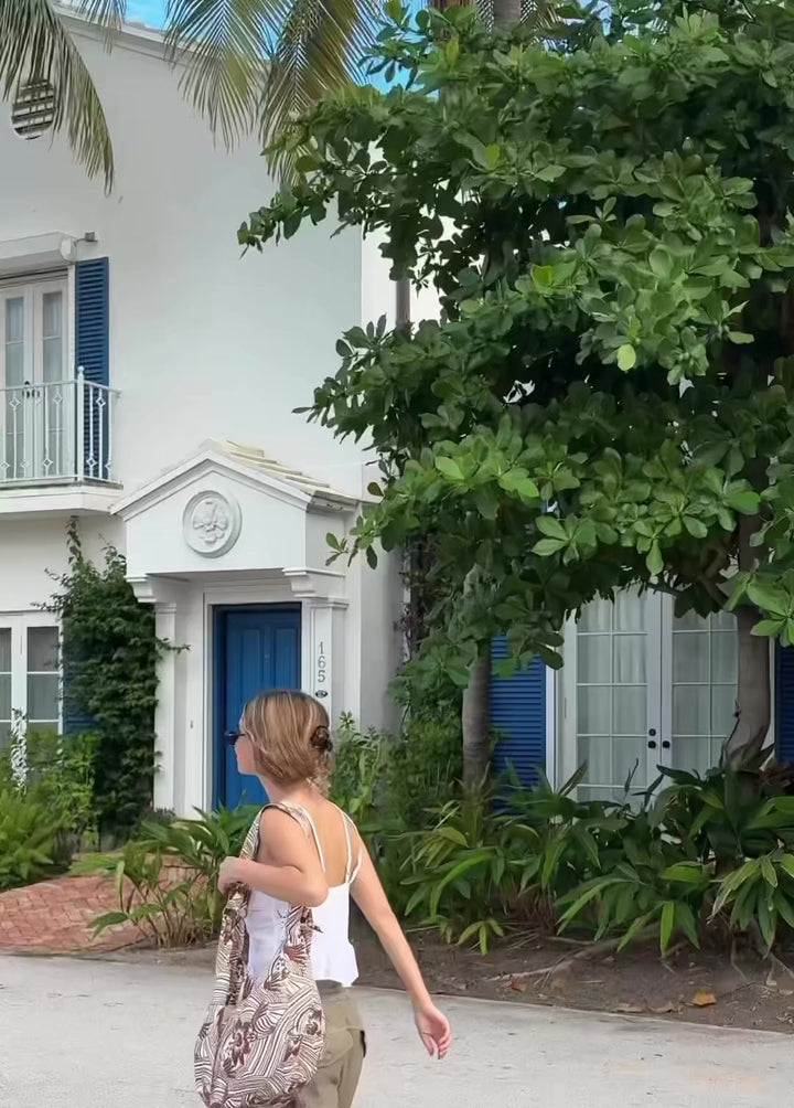 Warm brown, creamy white, and that retro-Hawaiian floral that feels timeless.